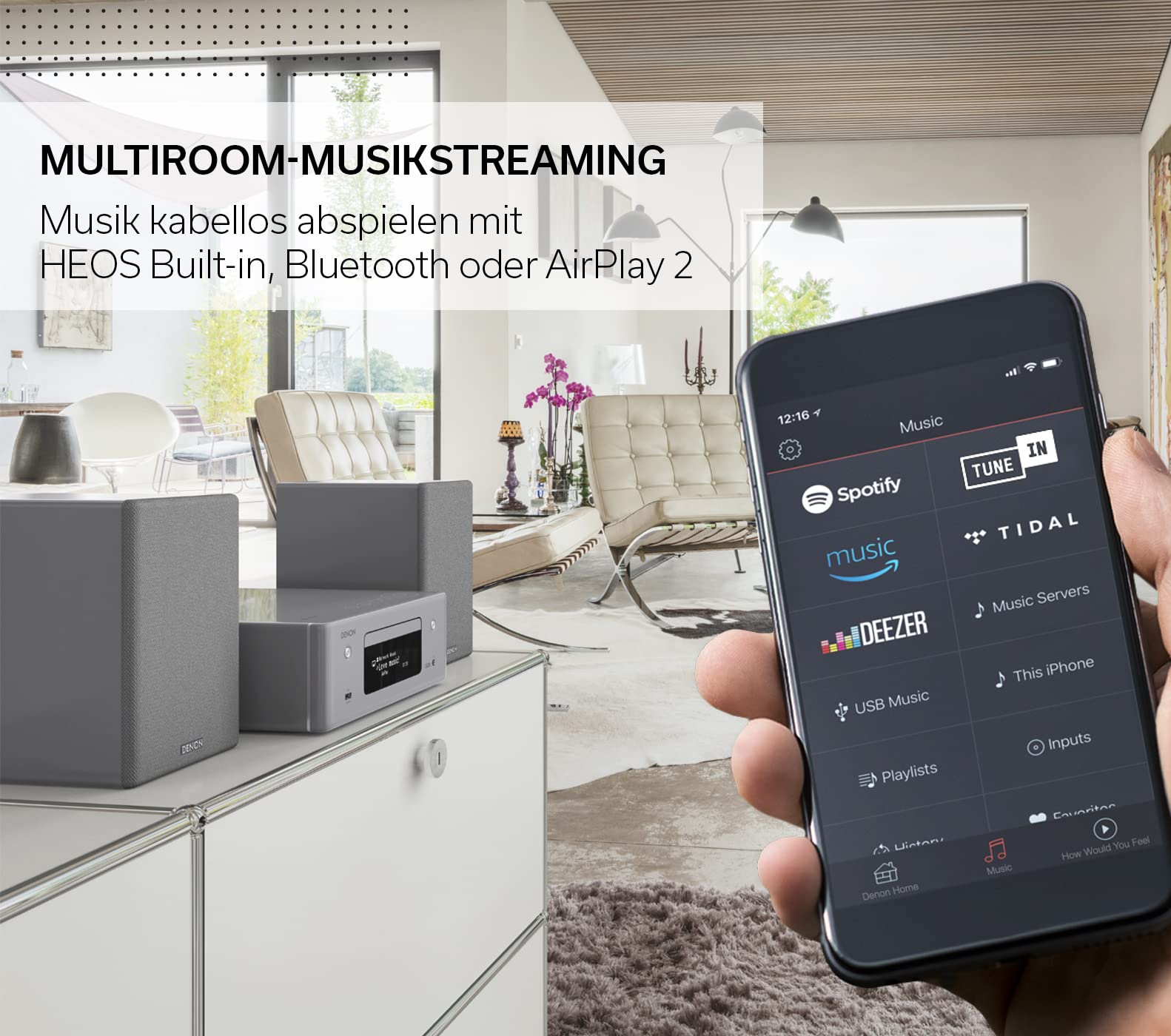 - AirPlay 2, radio por Internet, Spotify, Deezer, Tidal, Amazon Music