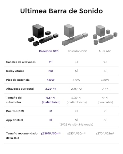 ULTIMEA 7.1 Barra de Sonido TV, Sistema de Sonido Envolvente Virtual, Control por App, 410W, Barra Sonido con Subwoofer y 4 Altavoces Envolventes, Bluetooth 5.3, Poseidon D70