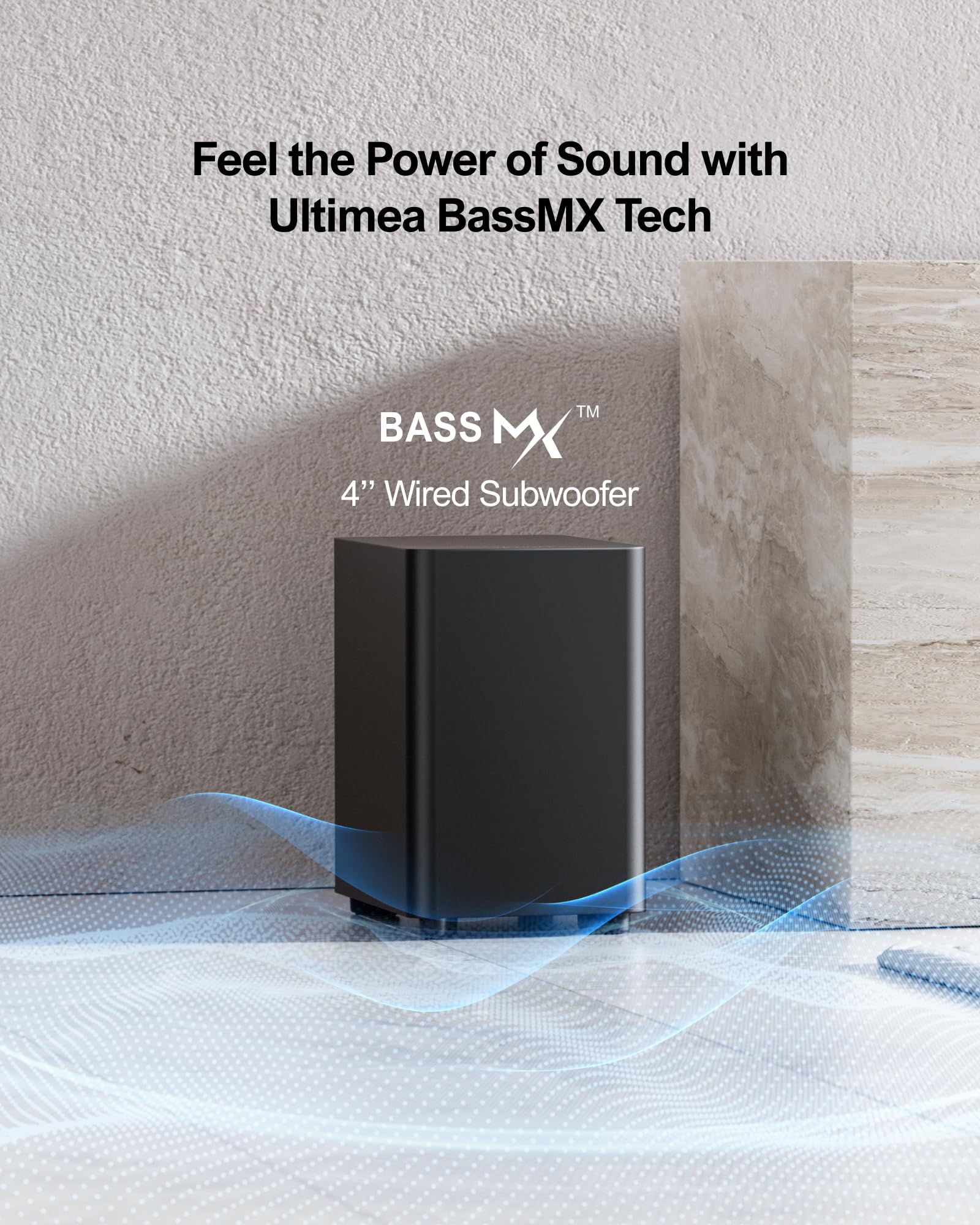 - Subwoofer con Cable de 4" con Tecnología BassMX: la barra de sonido para TV Ultimea TV cuenta con un subwoofer con cable de 4" con tecnología BassMX para un sonido de baja frecuencia mejorado. Su diseño optimizado ofrece graves profundos y resonantes, amplificando las escenas de acción y las explosiones con un impacto poderoso.