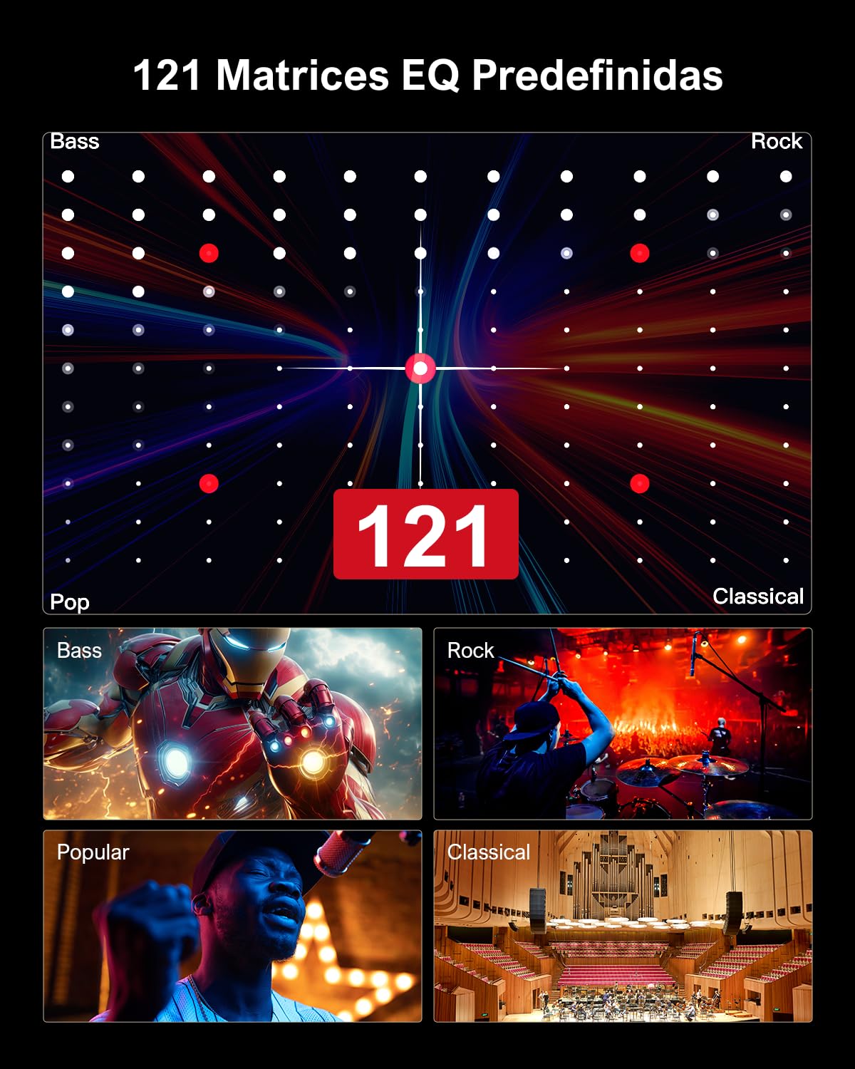 - 121 Matrices de Ecualización Preestablecidas: La aplicación Ultimea está diseñada para los entusiastas del audio con 121 matrices de ecualización preestablecidas, adaptadas a cuatro preferencias sonoras distintas: Bass, Pop, Classical y Rock. Explora la sintonización precisa y ajusta dinámicamente tu experiencia auditiva para lograr los efectos deseados.
